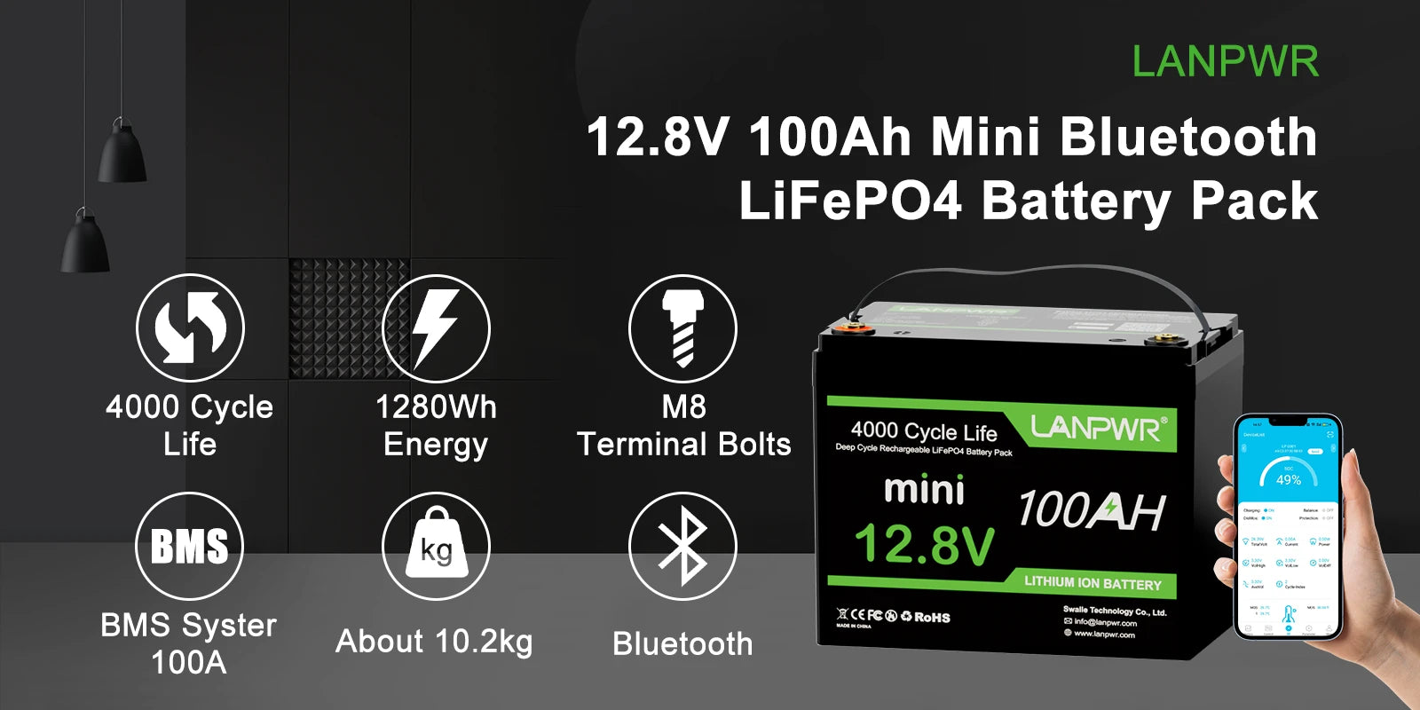LANPWR 12V 100Ah Mini Bluetooth LiFePO4 Lithium Battery