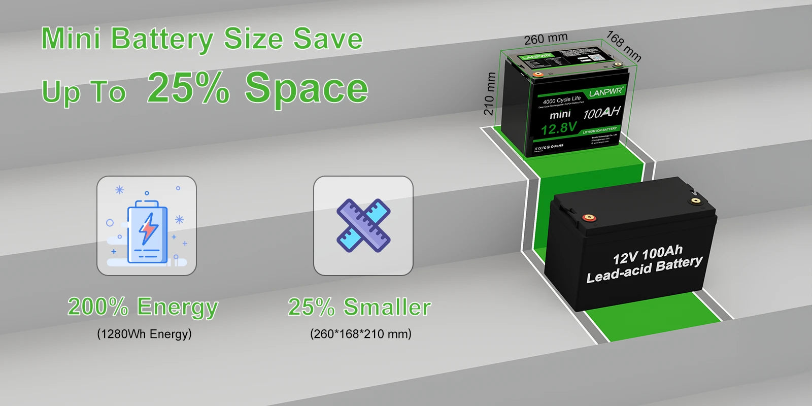 A: LANPWR 12V 100Ah lithium battery is a powerful replacement for Mini batteries due to its larger capacity than traditional AGM or Lead Acid batteries. It has a 100Ah capacity and 1280Wh energy, leaving you peace of mind to handle various situations.