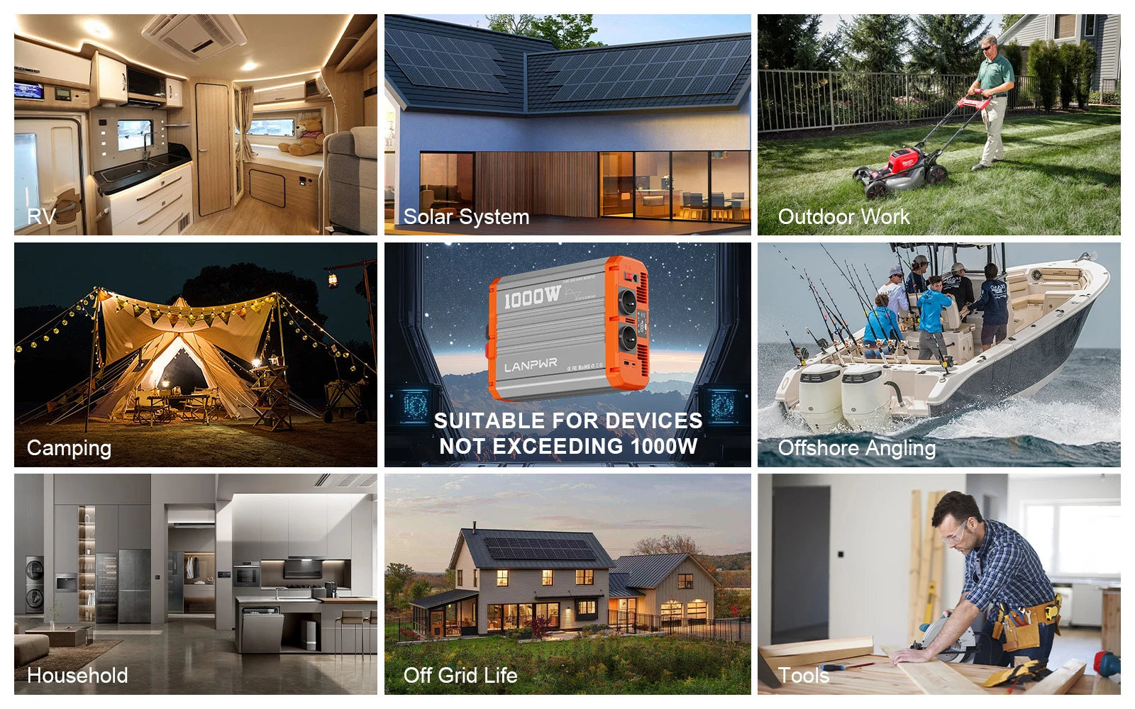 Whether you're off-grid in an RV, camping deep in nature, or preparing for a power outage, the LANPWR 1000W Inverter delivers the clean, dependable power you need. With pure sine wave output, it's safe for running laptops, CPAP machines, portable fridges, lights, and more—just like at home.