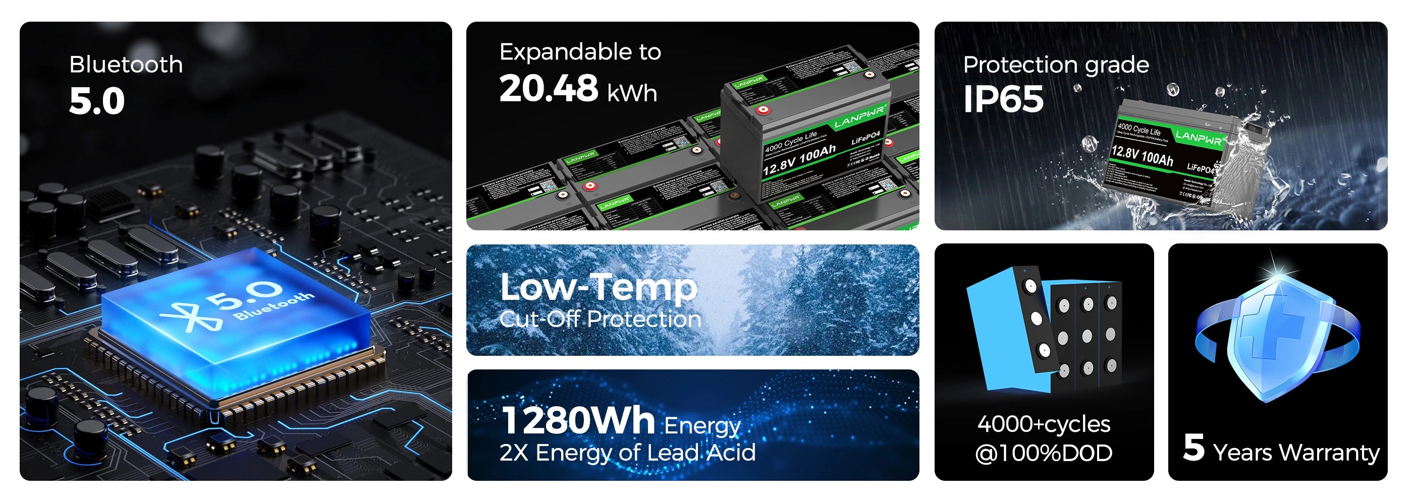 LANPWR 12V 100Ah Bluetooth LiFePO4 Lithium Deep Cycle Battery