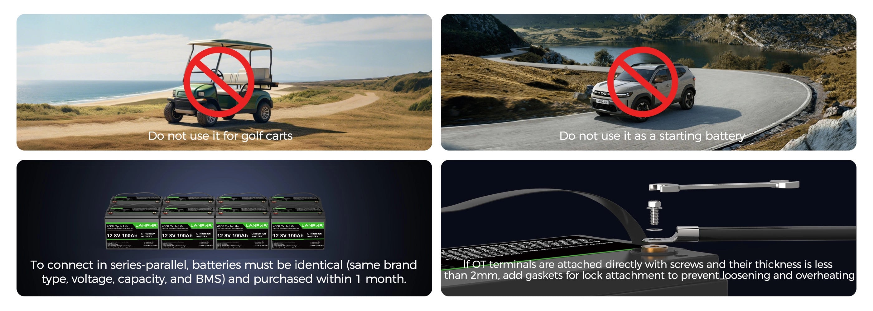 A: The maximum number of connecting LANPWR 12V 100Ah lithium batteries in series or parallel is 4 (4S or 4P). Please notice that the LANPWR lithium batteries can ONLY be connected in series or parallel with the same brand (LANPWR), same type (lithium), same voltage (V), same capacity (Ah), same BMS and similar purchasing date (within 3 months).