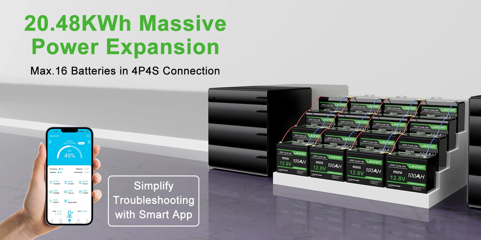 - Expandable: Series & parallel up to 16 batteries (max 4S4P), up to 20.48kWh.