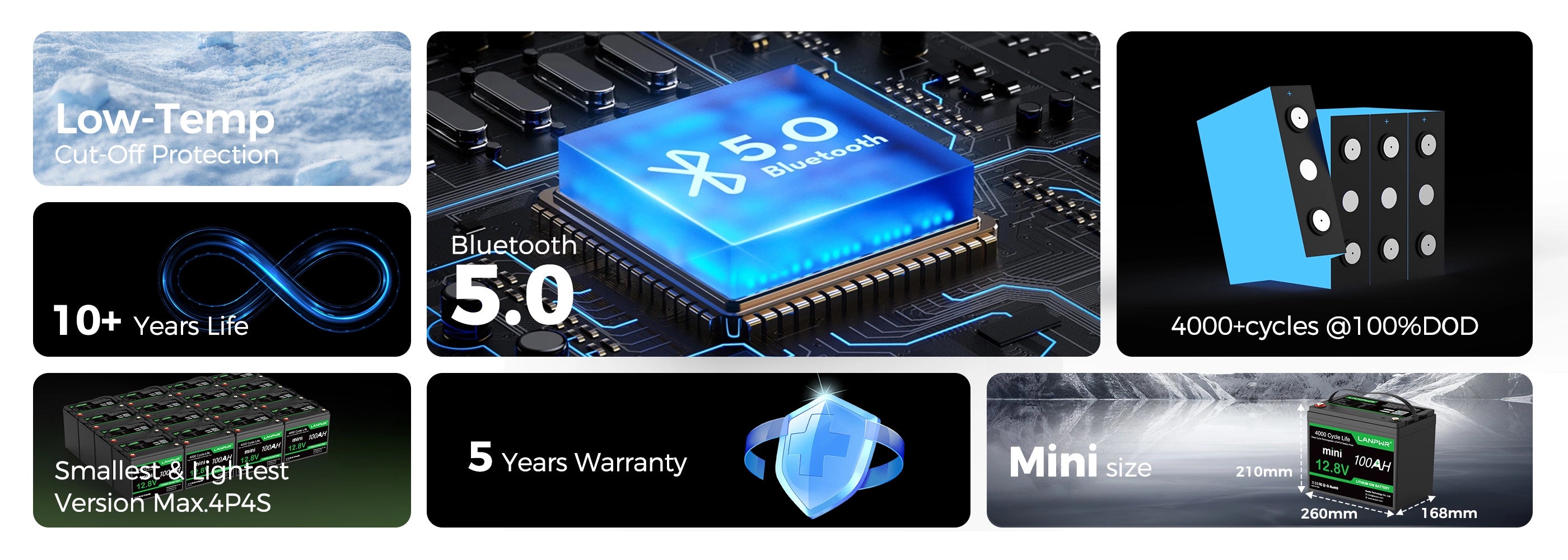 【Versatile and Expandable】LANPWR 12V 100Ah Mini Bluetooth LiFePO4 battery supports configurations up to 4S4P, enabling a robust 48V 400Ah system that delivers 20.48kWh energy and 20.48kW power. Ideal for RVs, solar installations, home energy storage, and off-grid applications, it offers versatile power solutions.