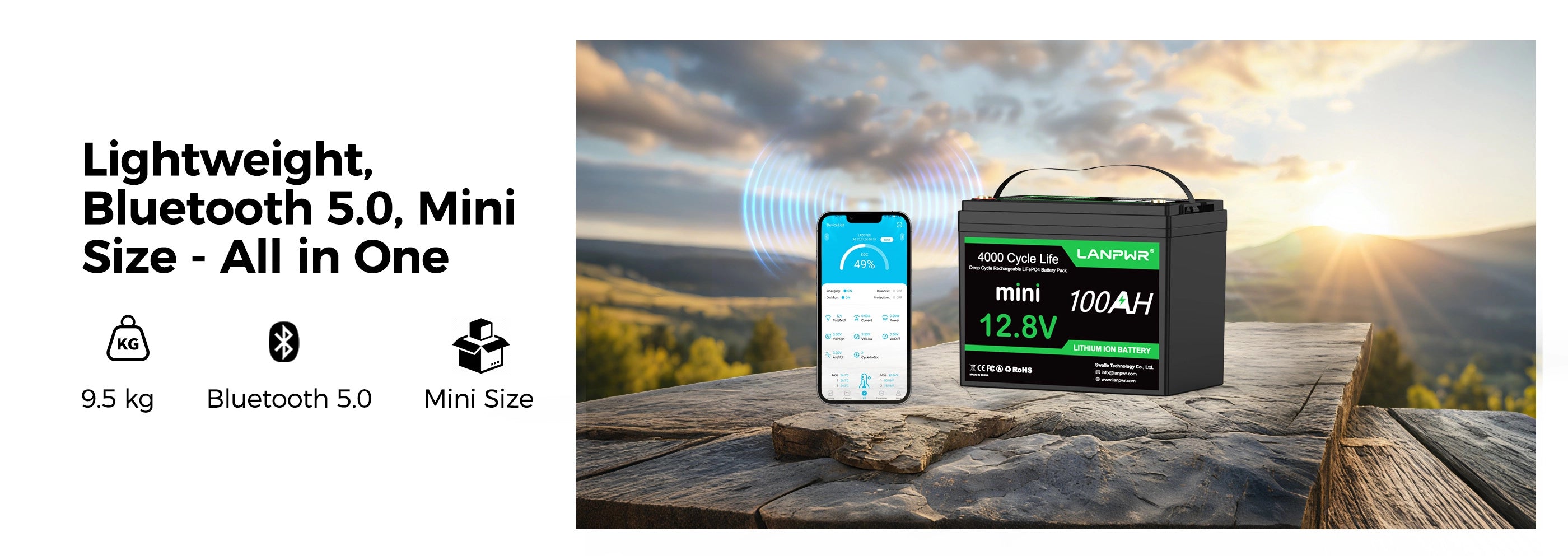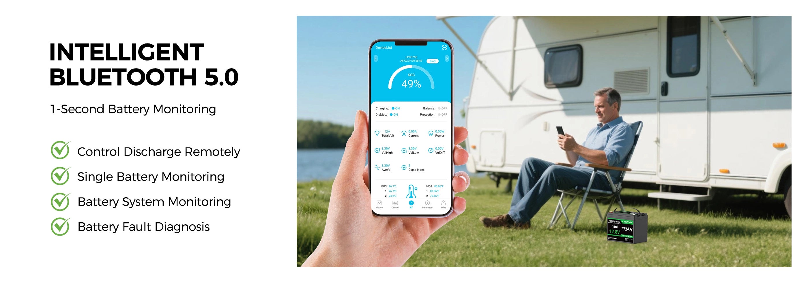 LANPWR 12V 100Ah Mini Bluetooth Lithium Battery for RV, Solar, Marine, and Backup