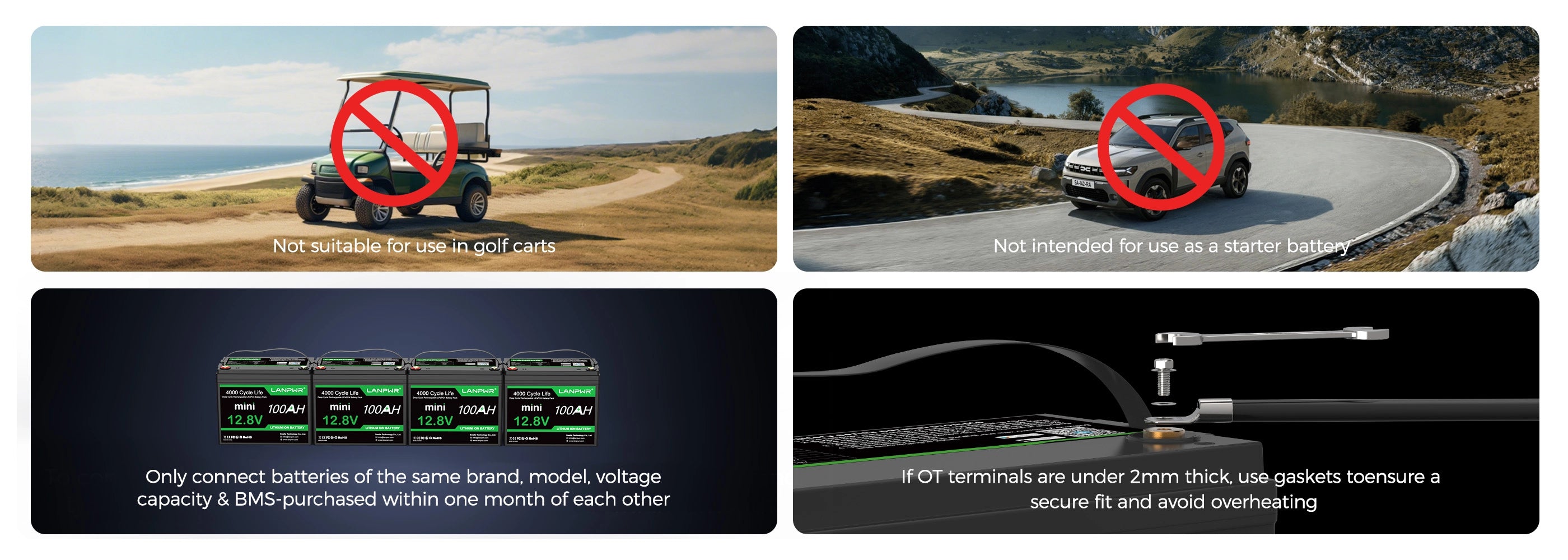 A: No. LANPWR LiFePO4 lithium batteries are not intended to be used as starting batteries but energy storage, please do not use them to start any devices. We also sell starting batteries. If necessary, please contact LANPWR team to obtain the purchase address.