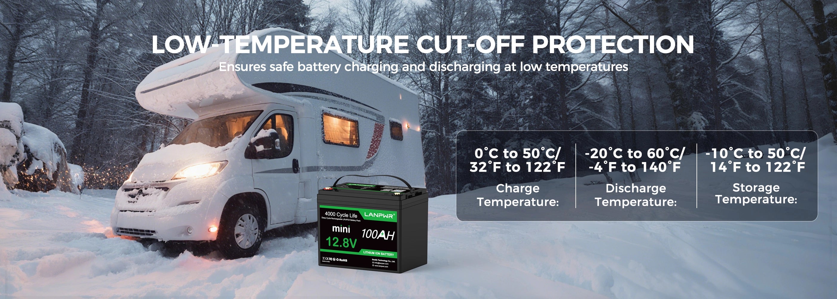 - Safety features: Built-in 100A BMS, low-temperature cut-off protection.
