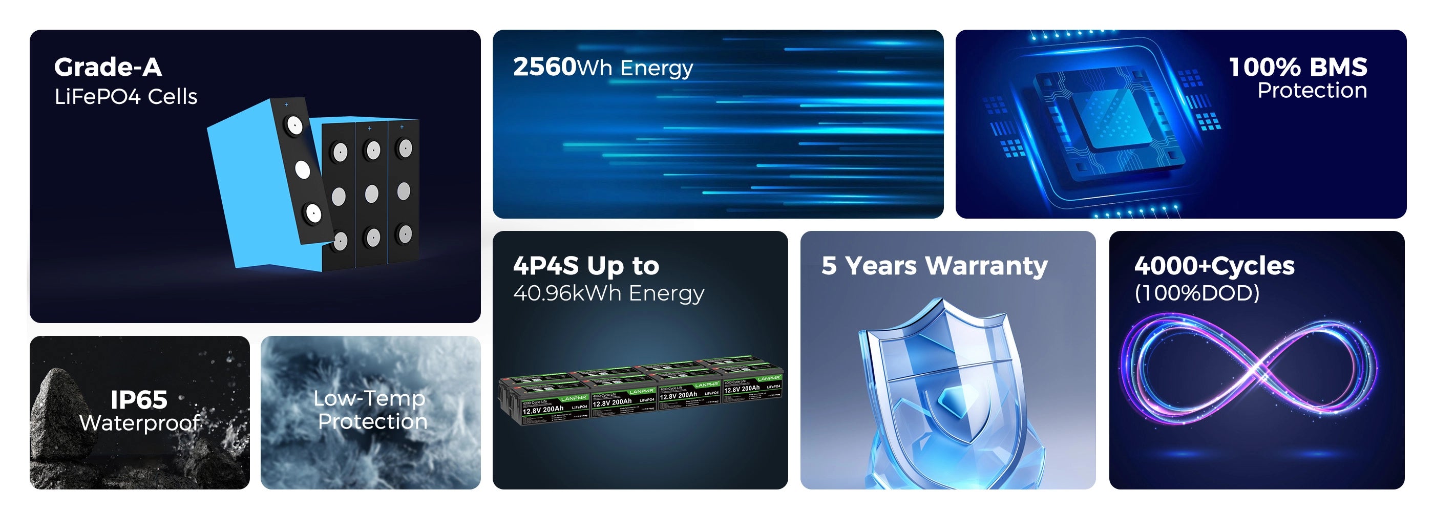 - EV Grade-A LiFePO4 Cells, 4000+ cycles@100%DOD