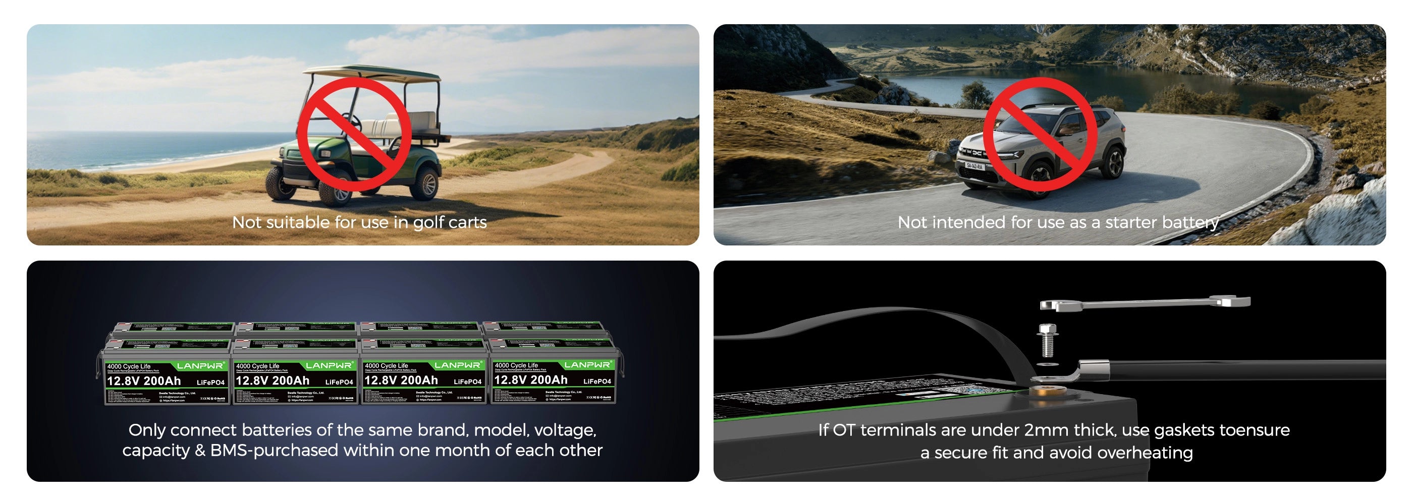 - DO NOT use as starter battery & DO NOT use it for golf carts or electric wheelchair/forklift, etc.