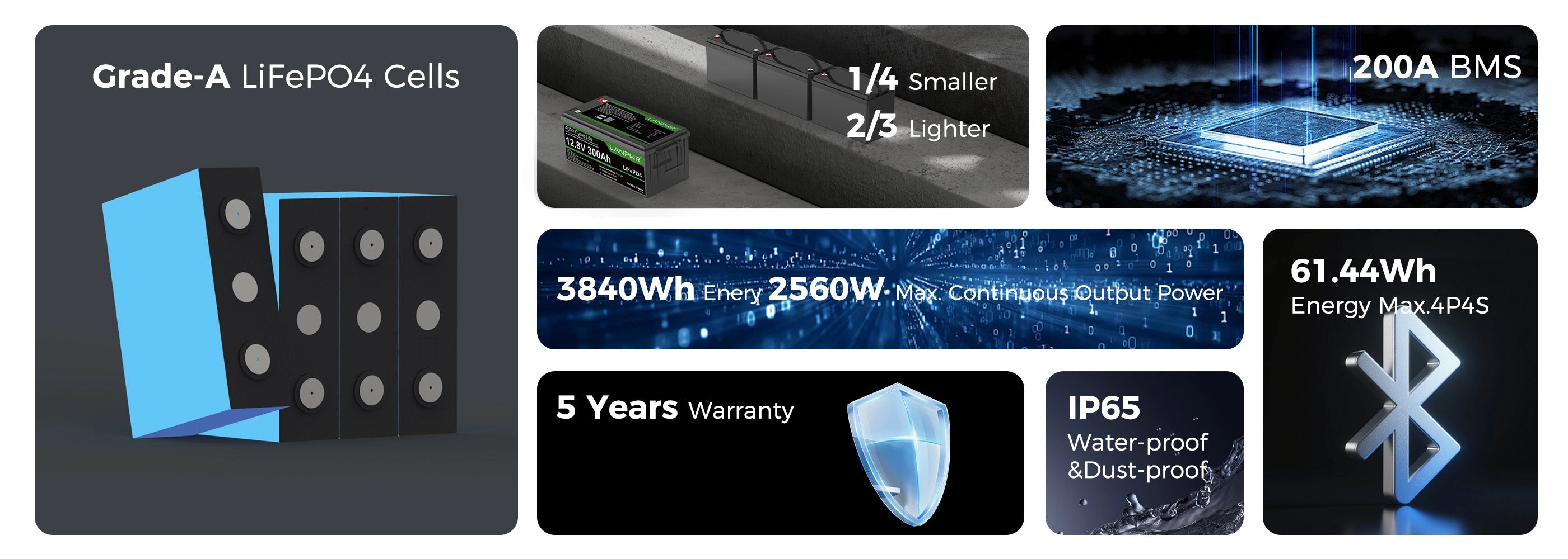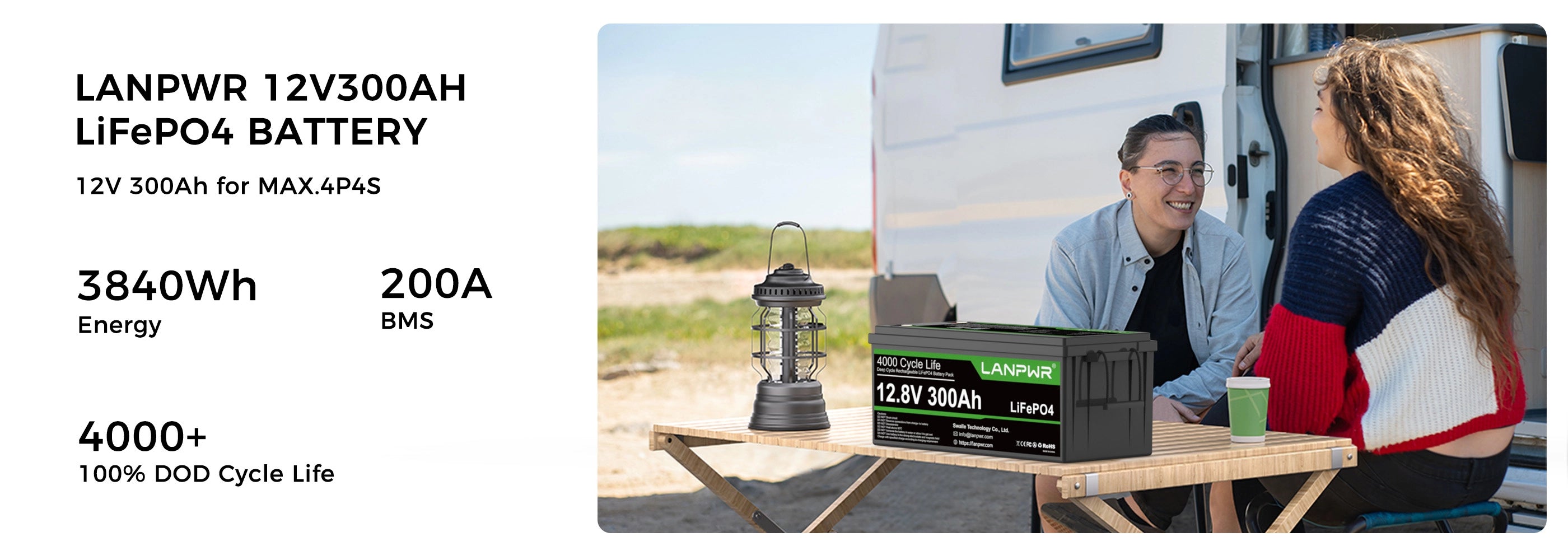 【Multi-Application】Because lithium batteries can be simply and easily connected in series and parallel as you need, 12V 300AH LiFePO4 batteries are perfect for off-grid solar systems and outdoor applications such as home backup power, RVs, camping, sailboats, and more.