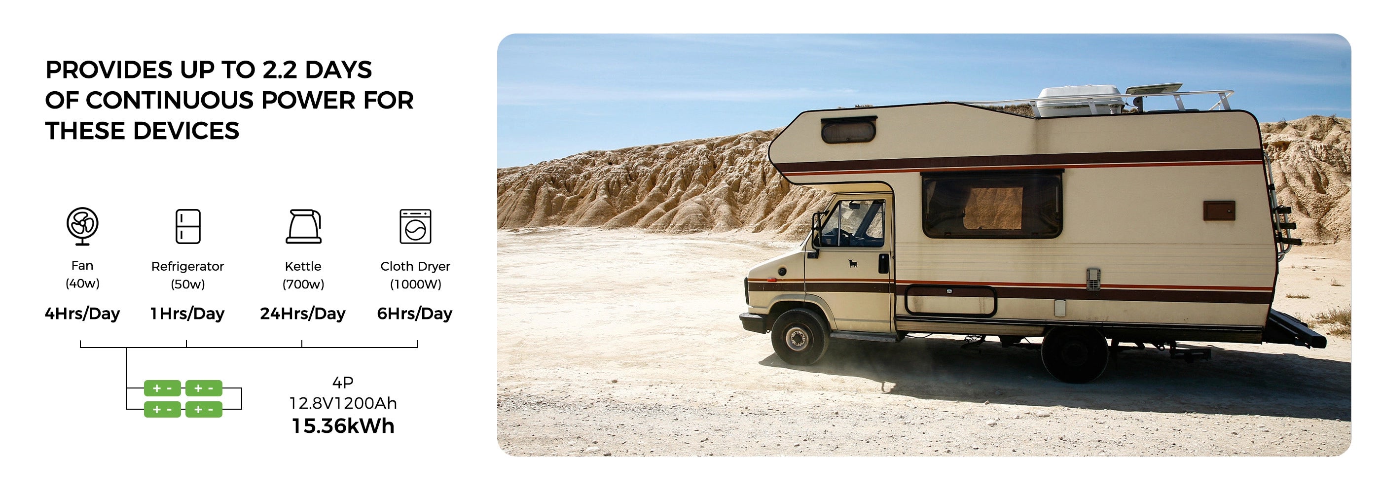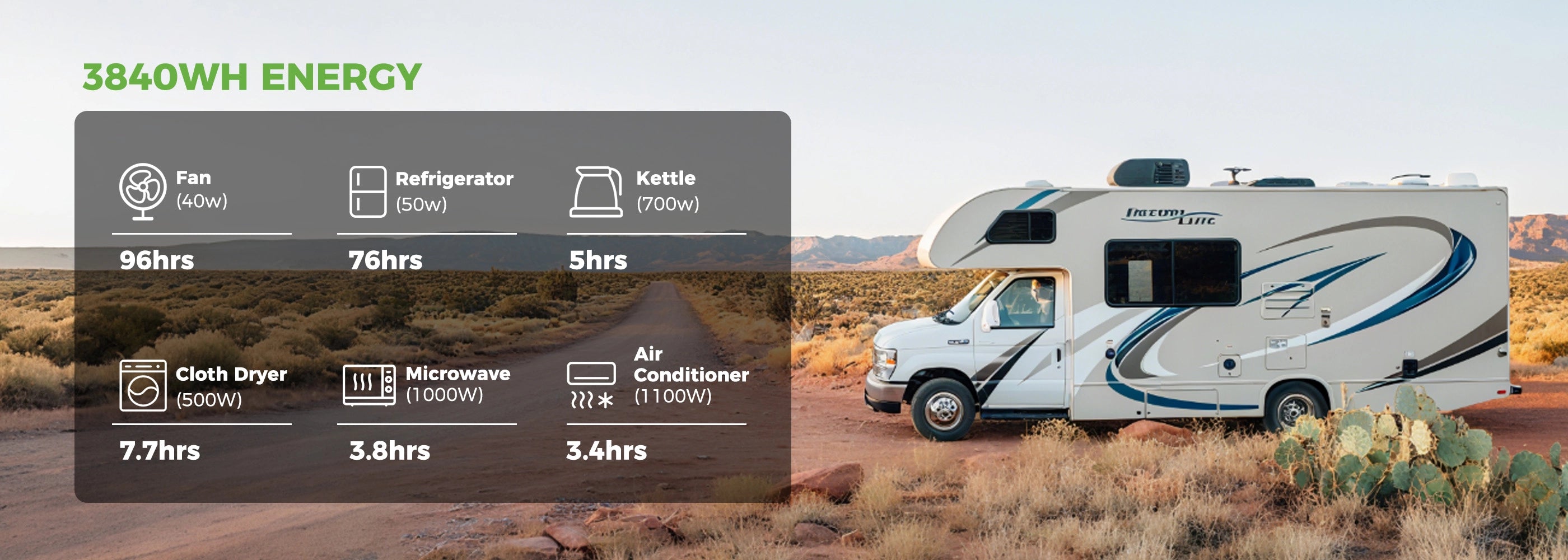 A: The runtime of a LANPWR 300Ah battery depends entirely on the specific appliances you're powering. With a solid 3840Wh capacity, here are some typical examples of what you can expect: