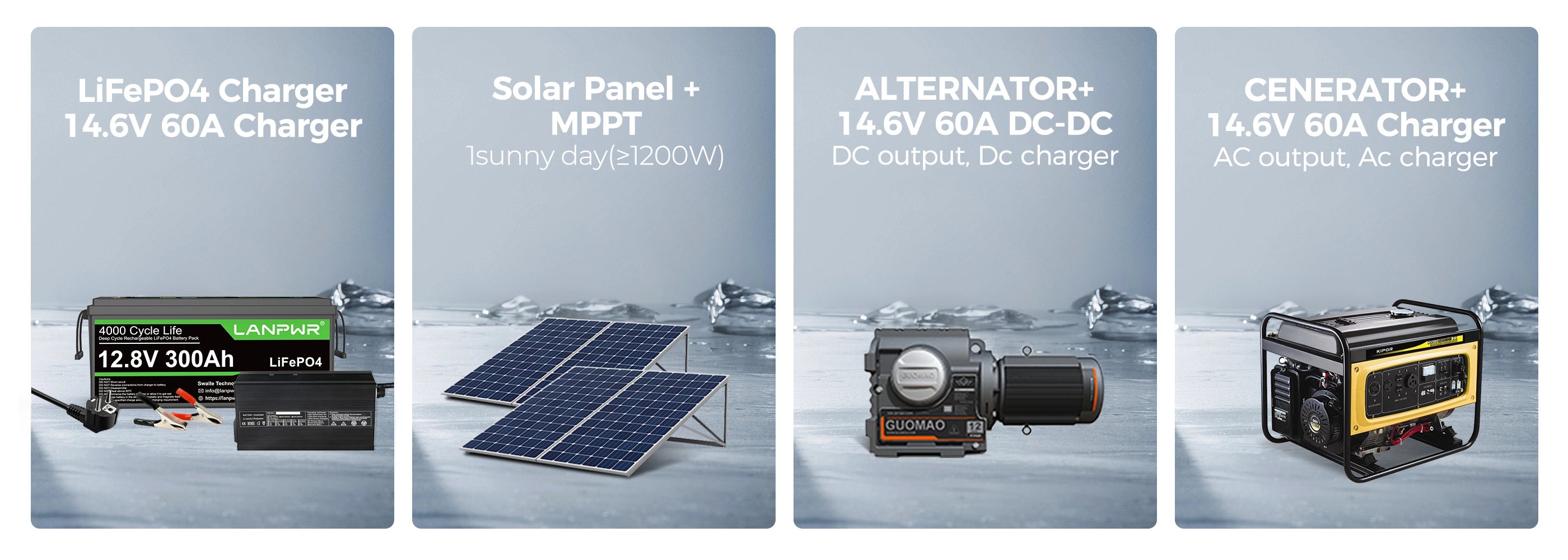 A: The LANPWR 12V 300Ah LiFePO4 lithium battery can be charged in several ways. Here are the most common methods: