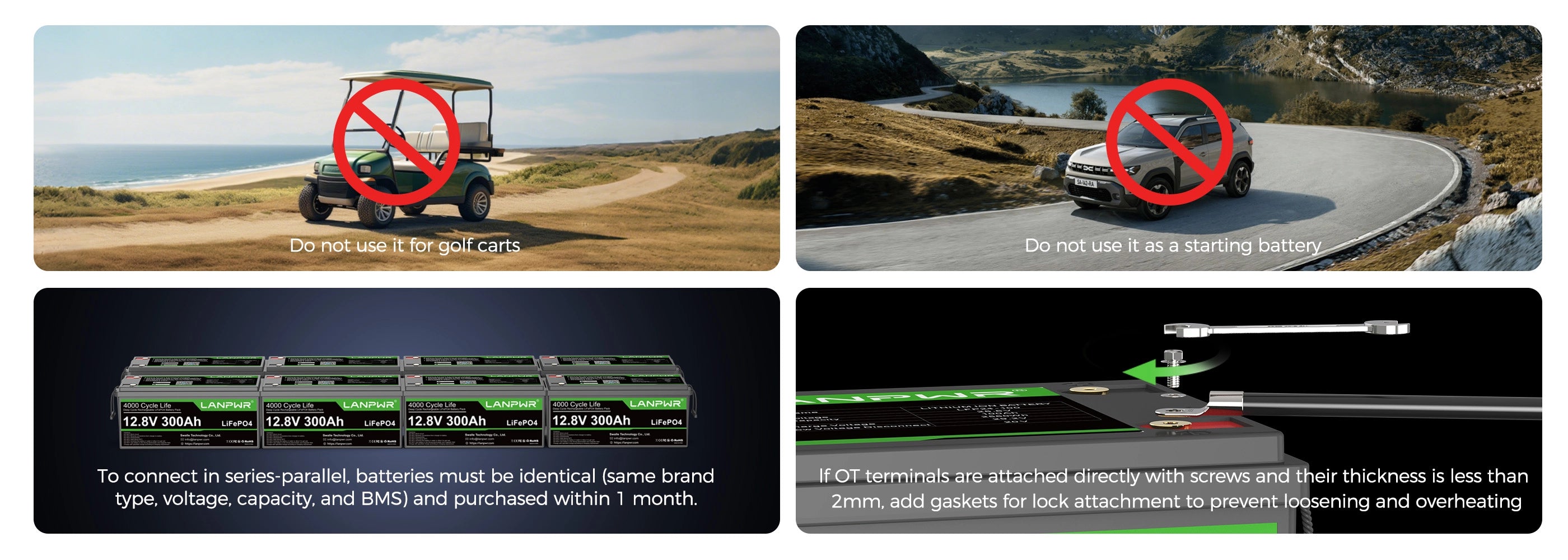 - DO NOT use as starter battery & DO NOT use it for golf carts or electric wheelchair/forklift, etc.