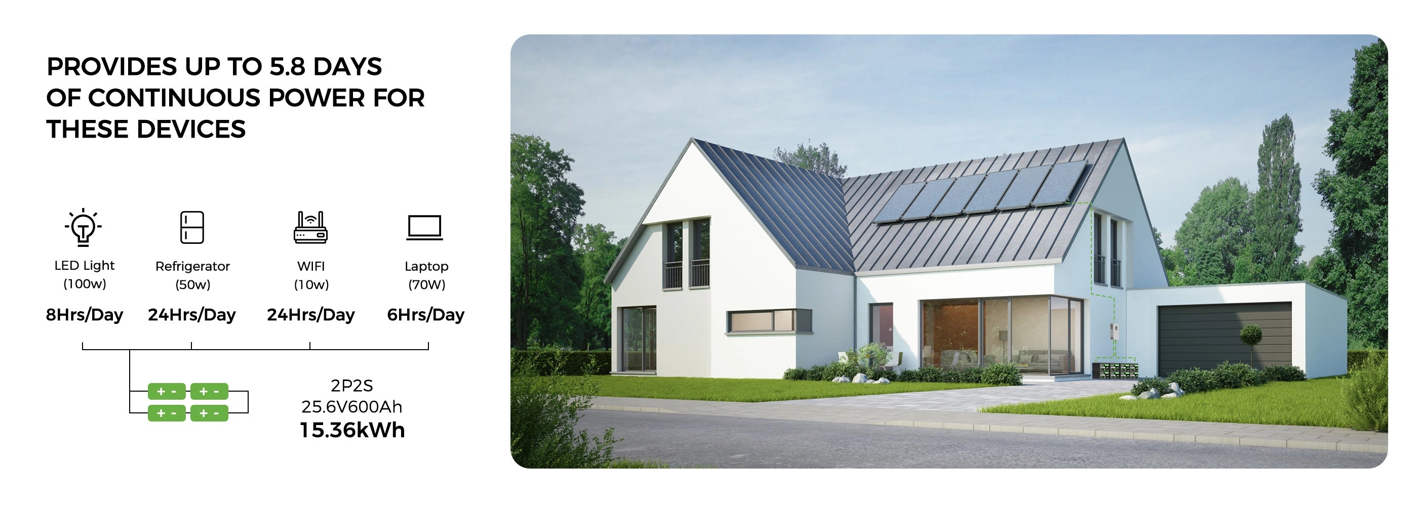 - Flexible in Series and Parallel (Max 61.44kWh expandable energy, up to 16 batteries Max 4S4P, up to 61.44kWh)