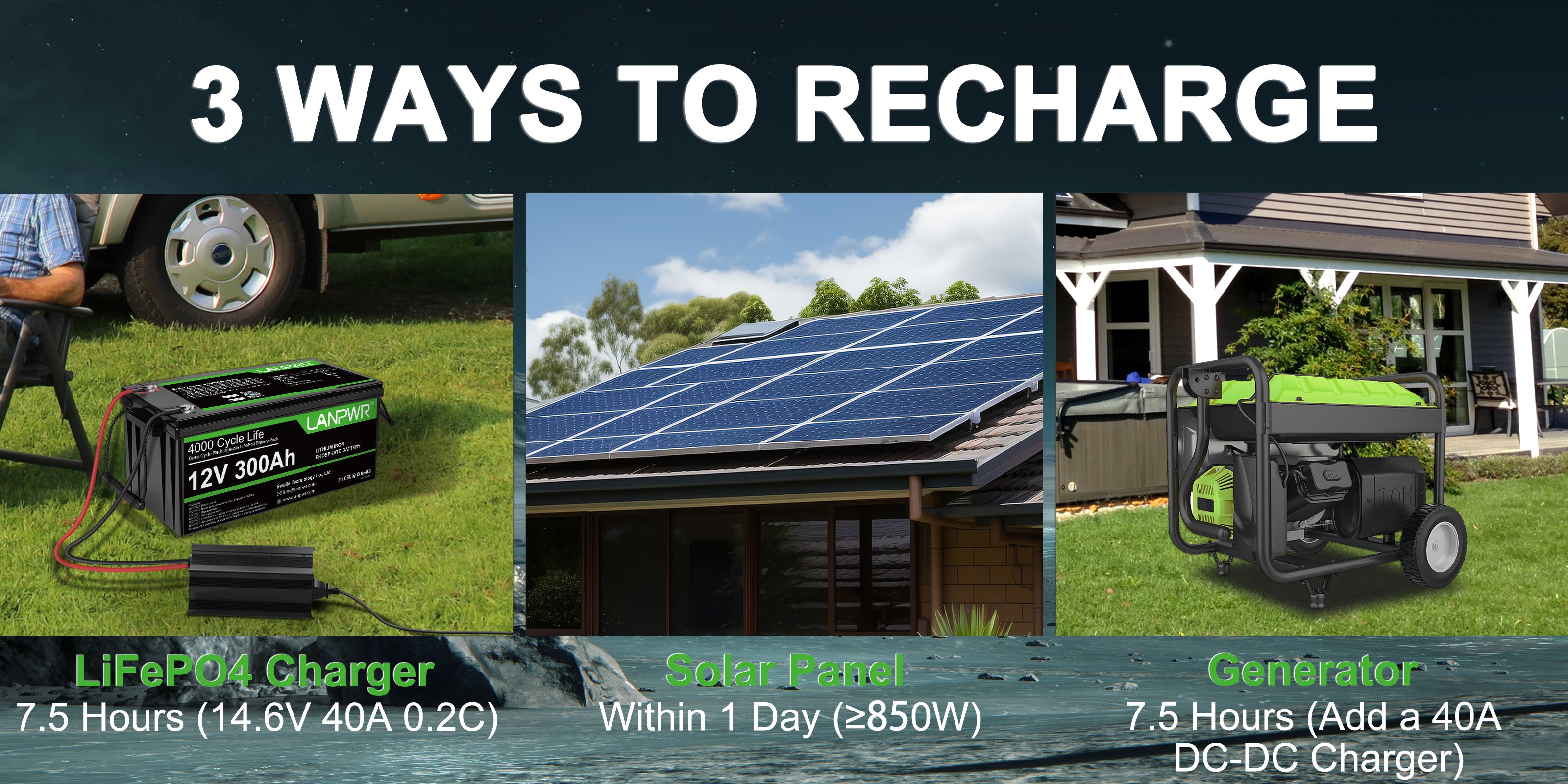 【Upgraded BMS】Lanpwr 12V 300Ah LiFePO4 can be charged at a current of up to 200A, doubling the previous capacity of 100A. This enhancement enables it to handle high output current loads, making it a dependable power source for all your energy needs.