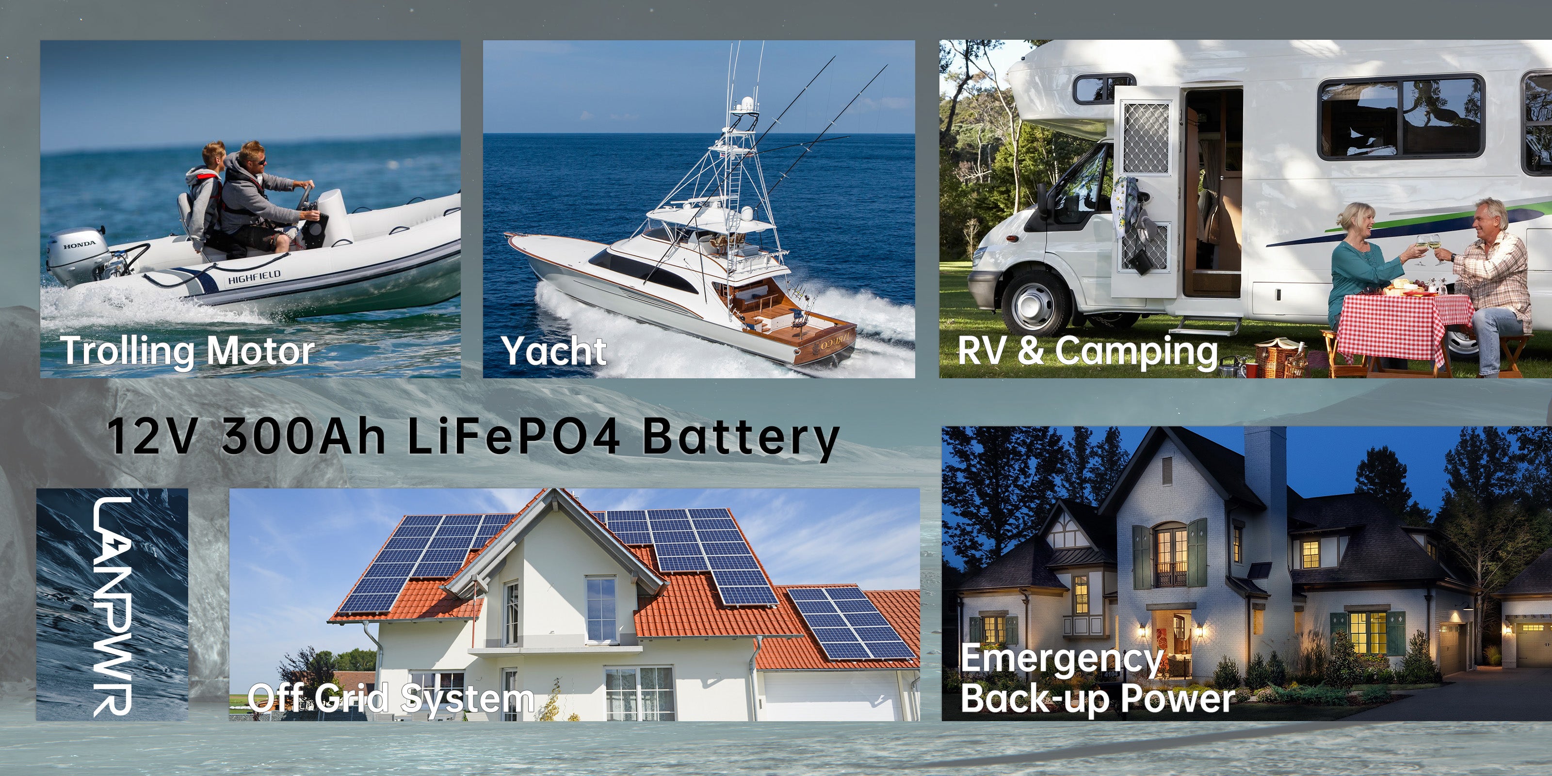 【Multi-Application】Because lithium batteries can be simply and easily connected in series and parallel as you need, 12V 300AH LiFePO4 batteries are perfect for off-grid solar systems and outdoor applications such as home backup power, RVs, camping, sailboats, and more.