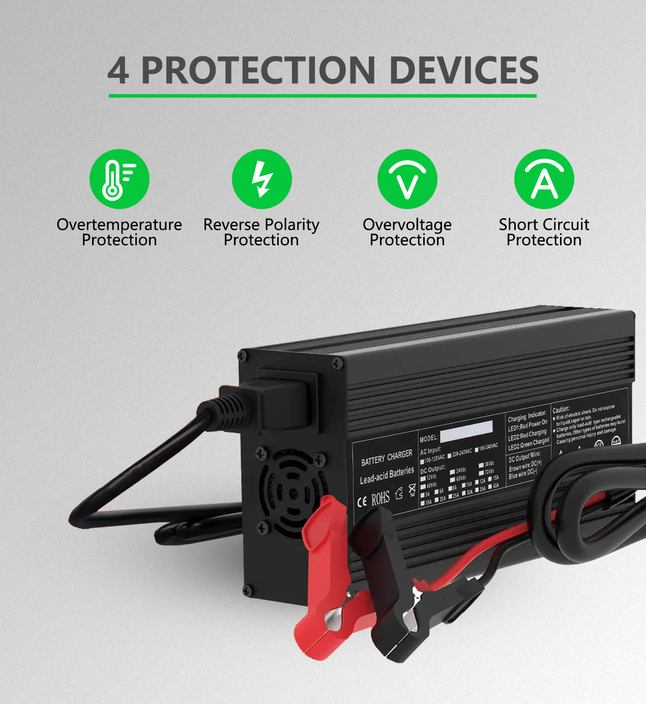 - Comprehensive Safety Protection: Equipped with four safety protection features, including overheat protection, output short circuit protection, reverse polarity protection, and output overvoltage protection. The cooling fan effectively prevents the charger from overheating during long-term use, protecting internal components and extending its service life.